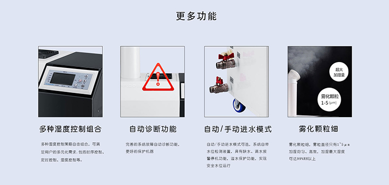 ※ 濕度數(shù)碼全自動控制,控制系統(tǒng)配備進口濕度傳感器,控制精度高、反應(yīng)迅速。設(shè)定后連續(xù)工作, 無 需人員職守